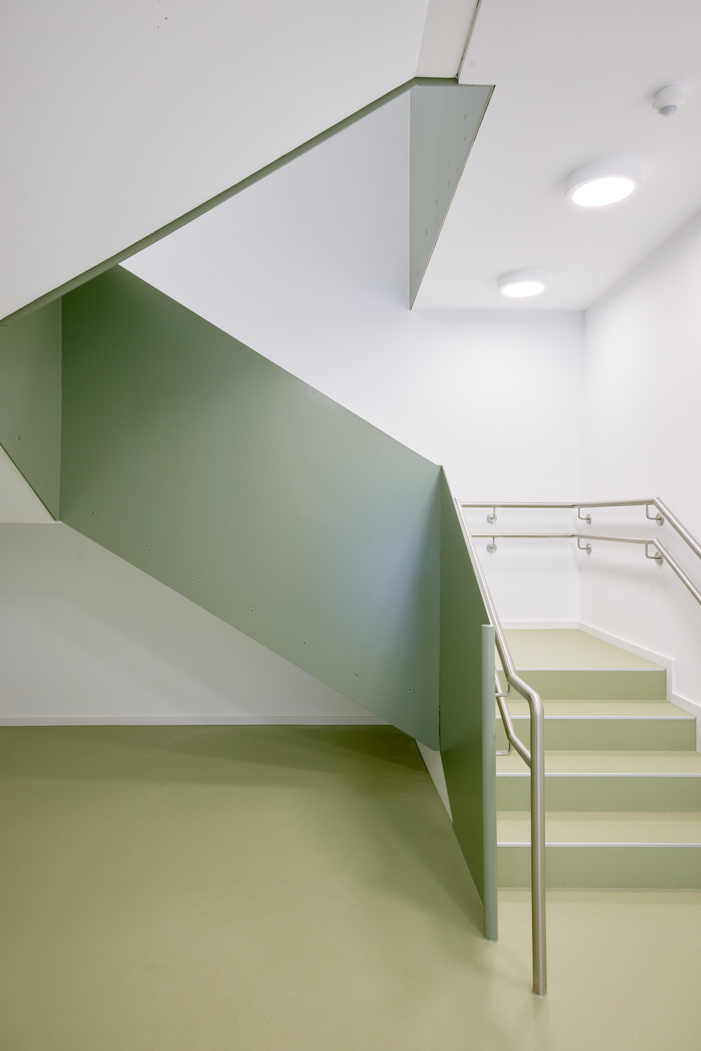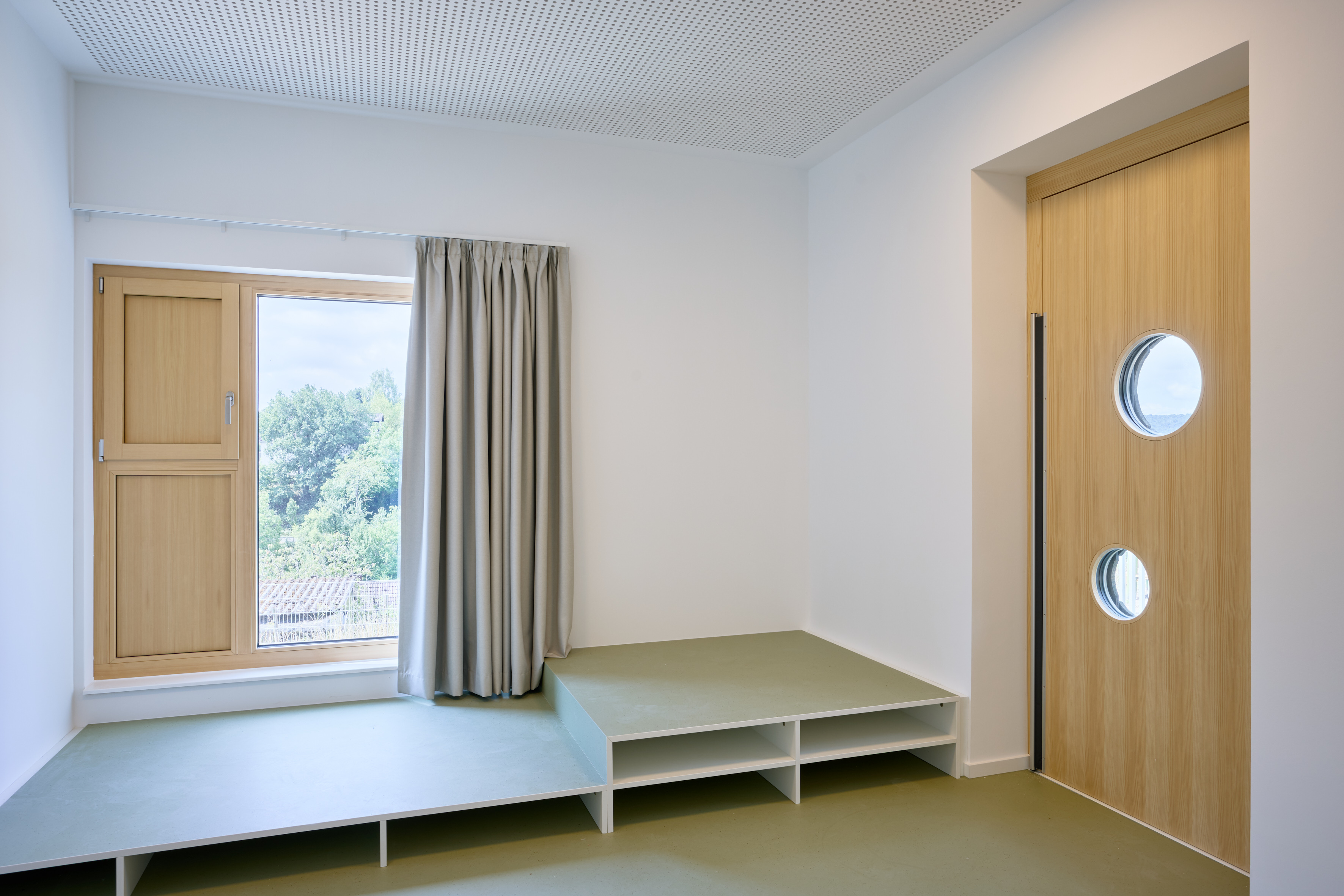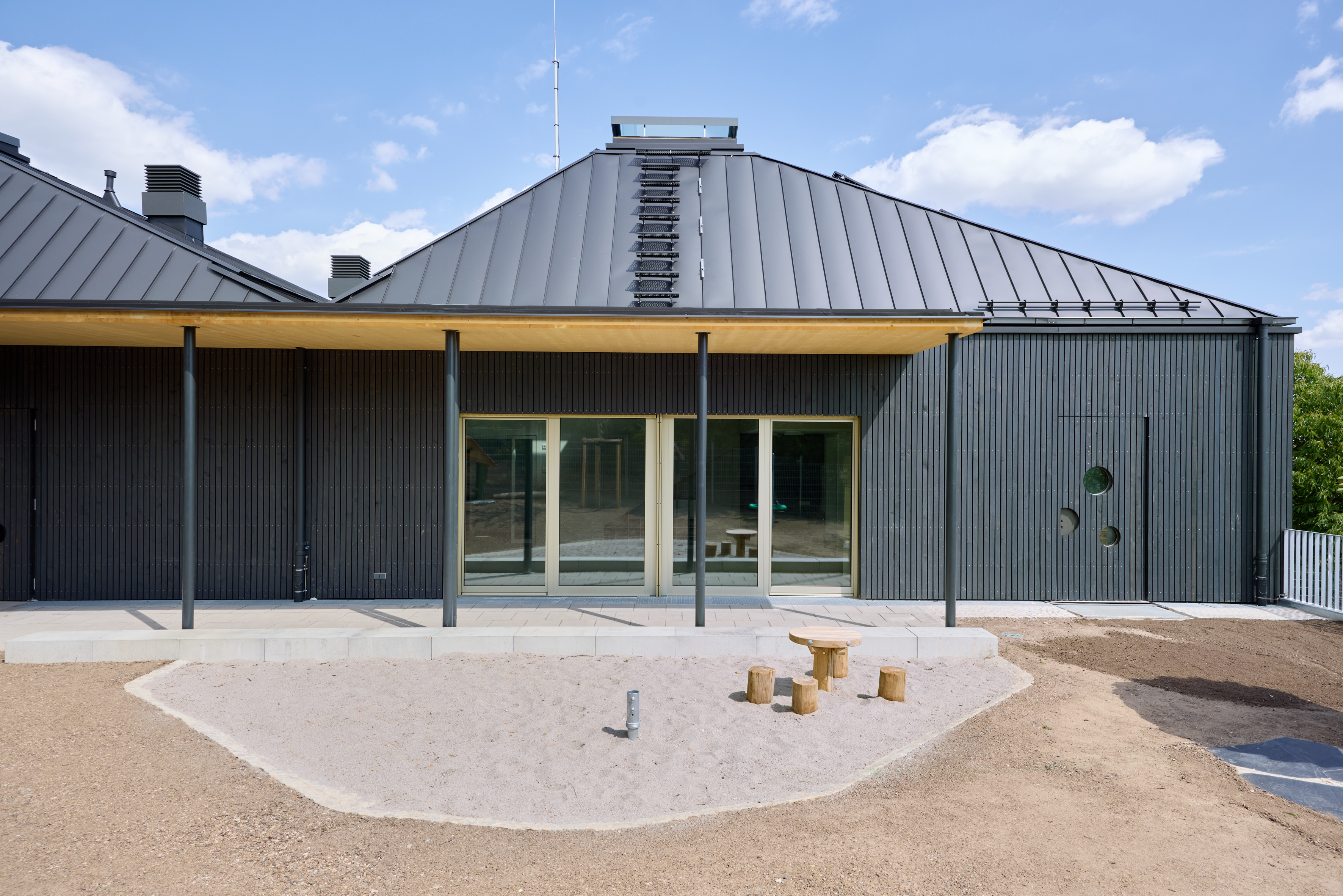 The centre is energy-efficient, using heat pumps with underfloor heating, roof-mounted photovoltaics for on-site electricity and rainwater cisterns for irrigation. The result is a sustainable, child-friendly building with a clear architectural identity.