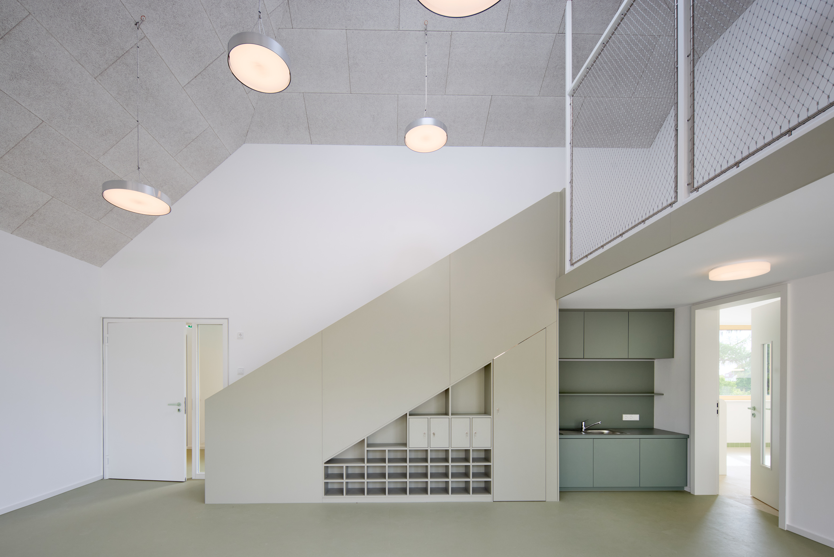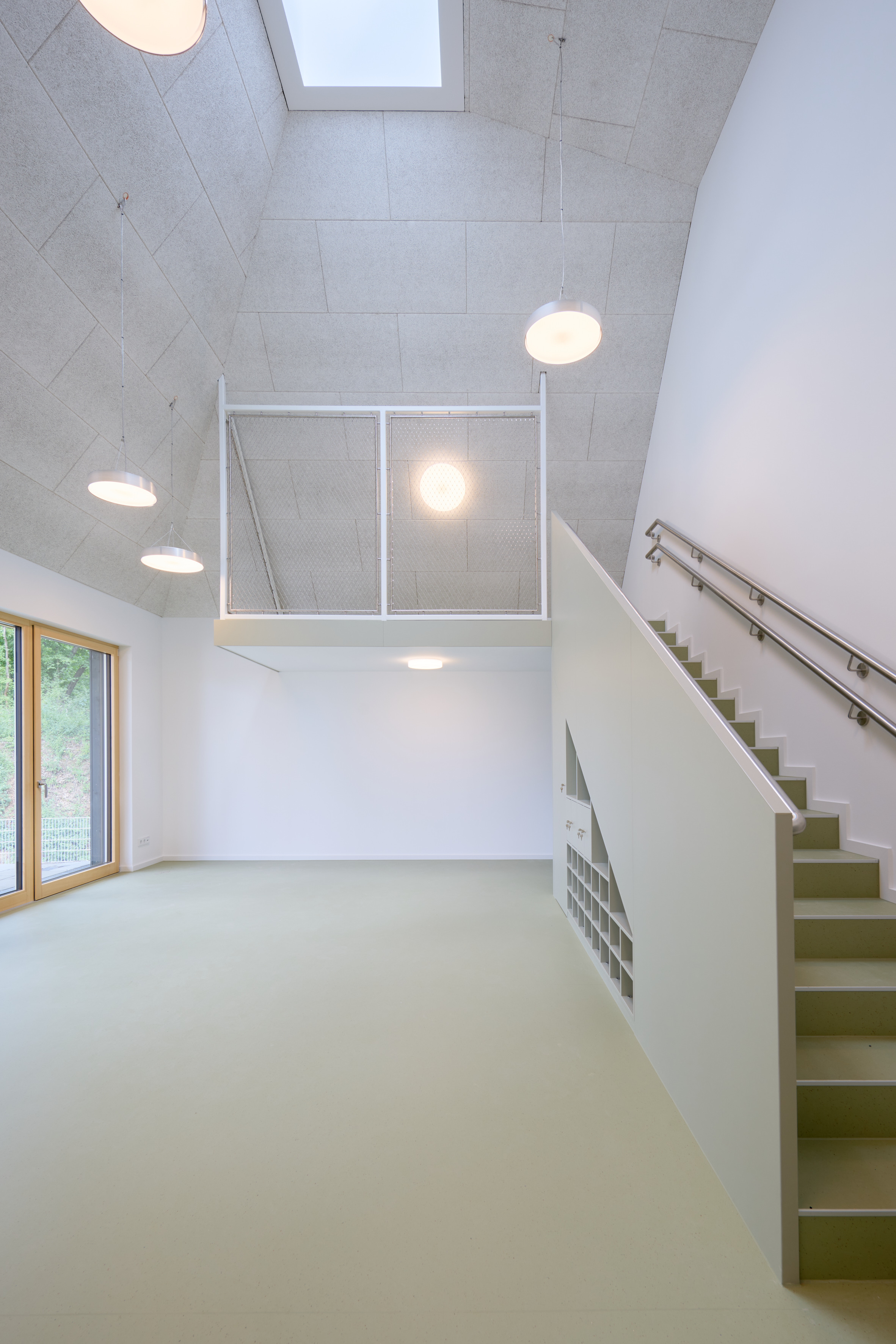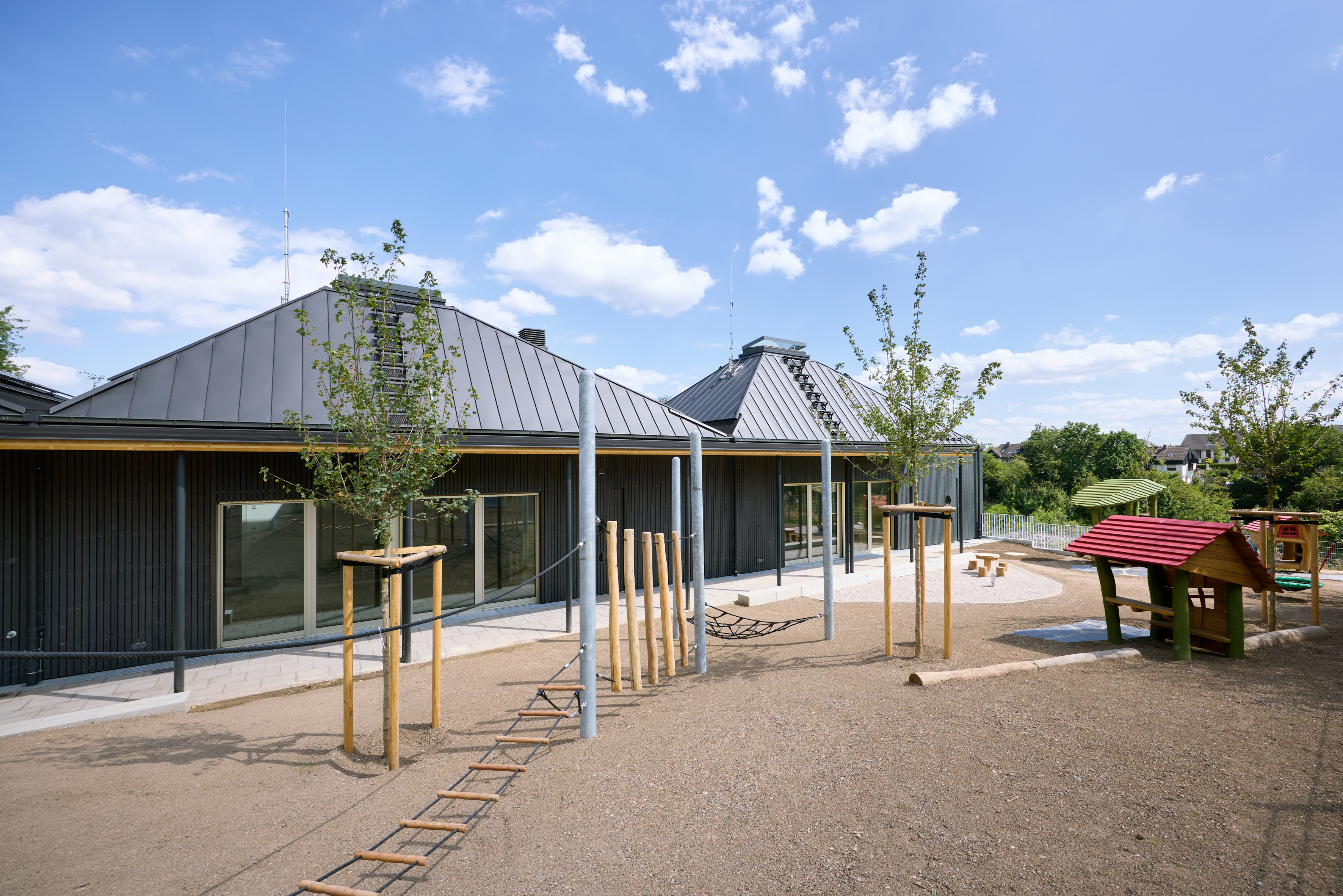 On the entrance level are the crèche group, a multipurpose room, administration, and the kitchen. An open stair leads to the upper floor with three group rooms beneath the high pyramid roofs. Skylights draw daylight deep inside; generous heights, suspended play levels and simple built-ins create calm, varied spaces for play and retreat. Large glazed openings connect the rooms to the play garden, sheltered by a continuous canopy. The garden combines classic equipment with natural elements such as tree trunks and boulders to encourage exploratory play.