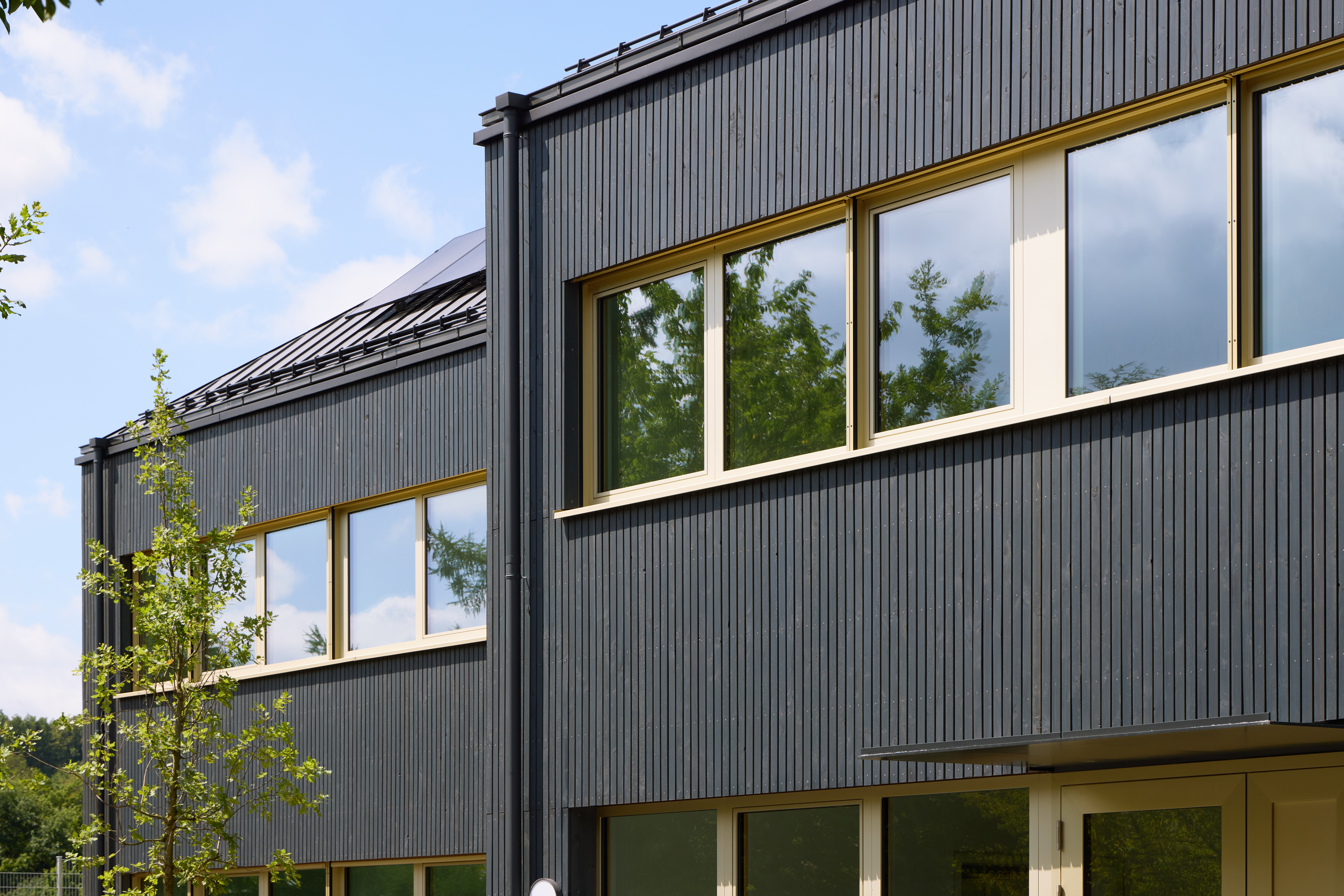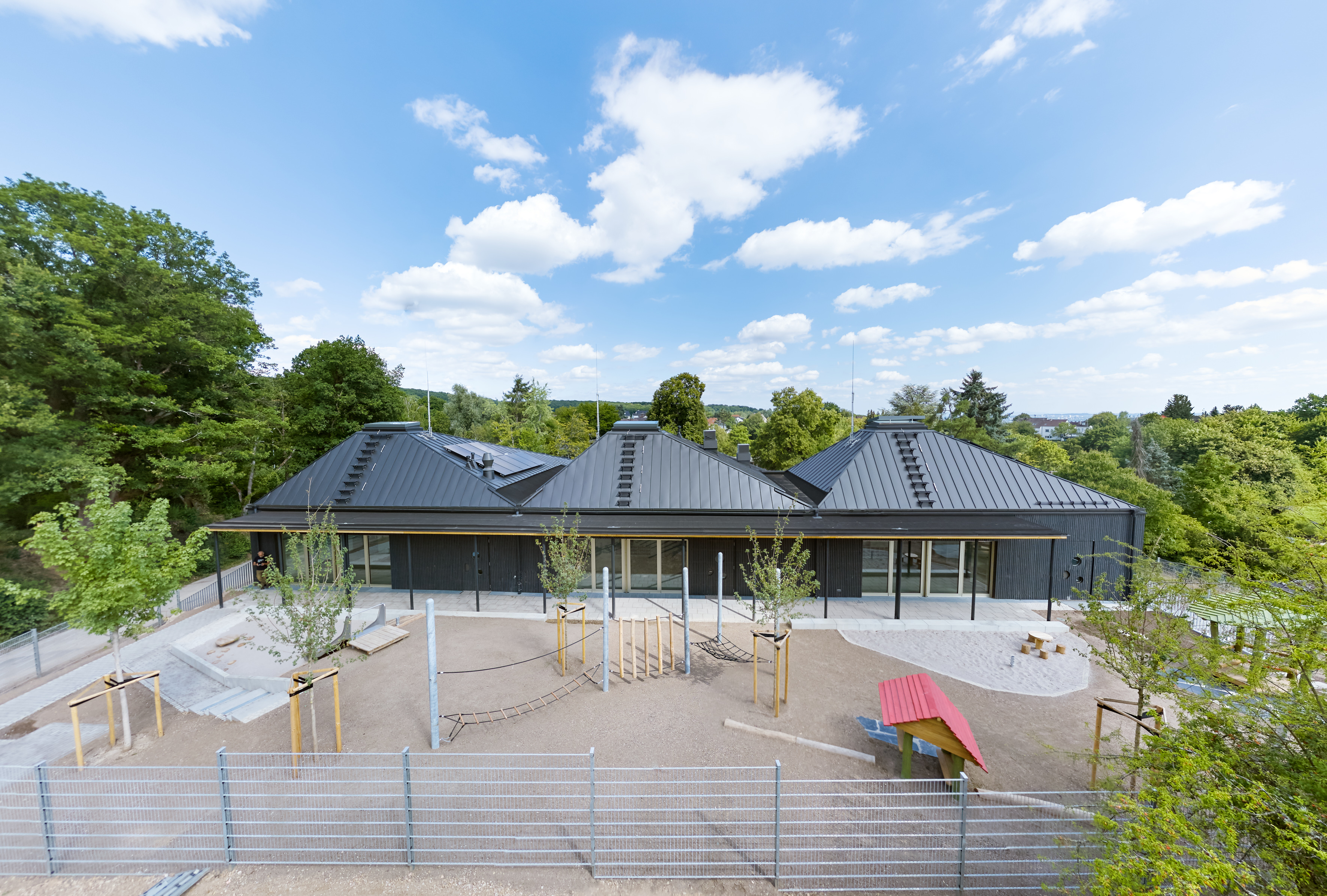Three dark pyramids define the silhouette of the new St. Georg Kindergarten in Frauenstein, an outskirt of Wiesbaden. The two-storey centre for 80 children consists of three equal volumes with truncated pyramid roofs fitted with photovoltaics. Set into the slope, the building blends naturally into the terrain, while light ribbon windows structure the dark timber façade.
