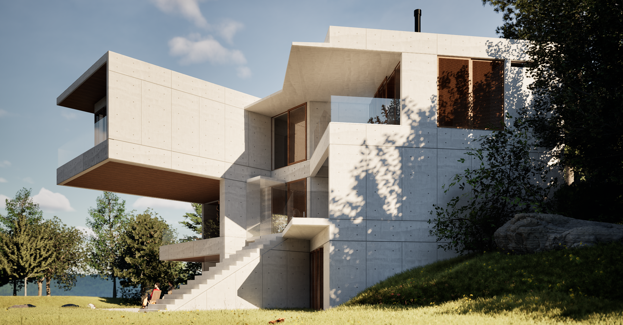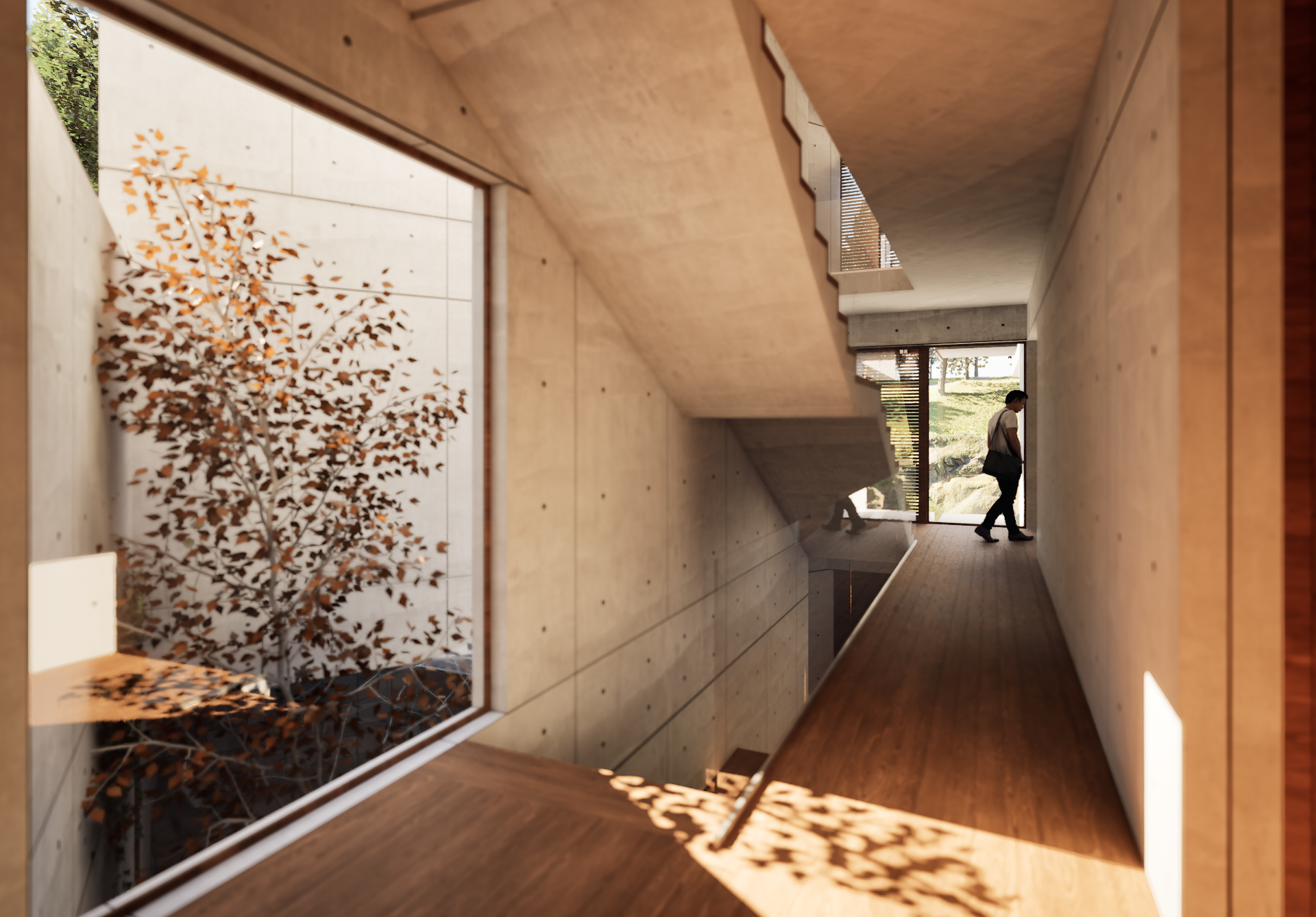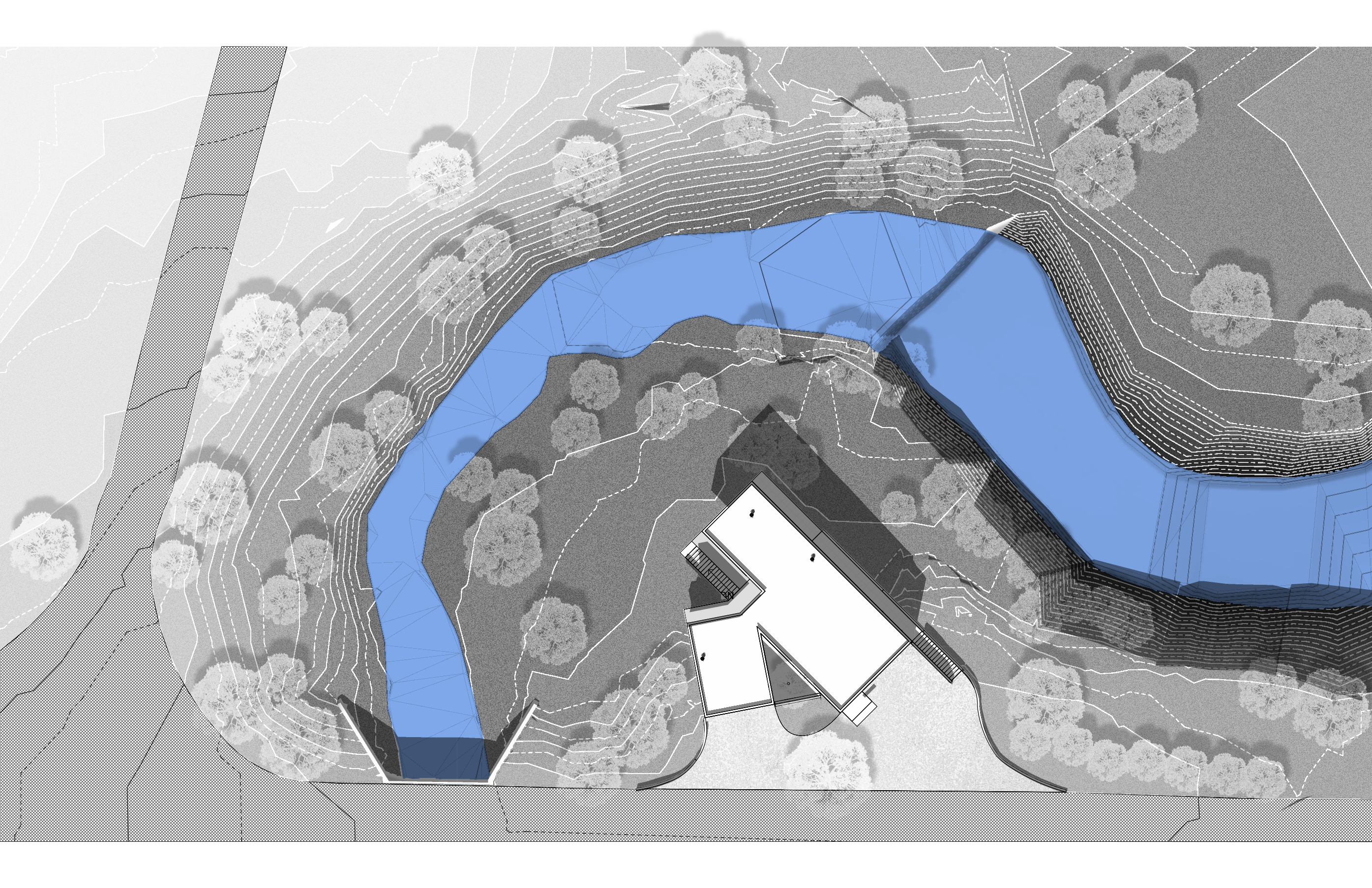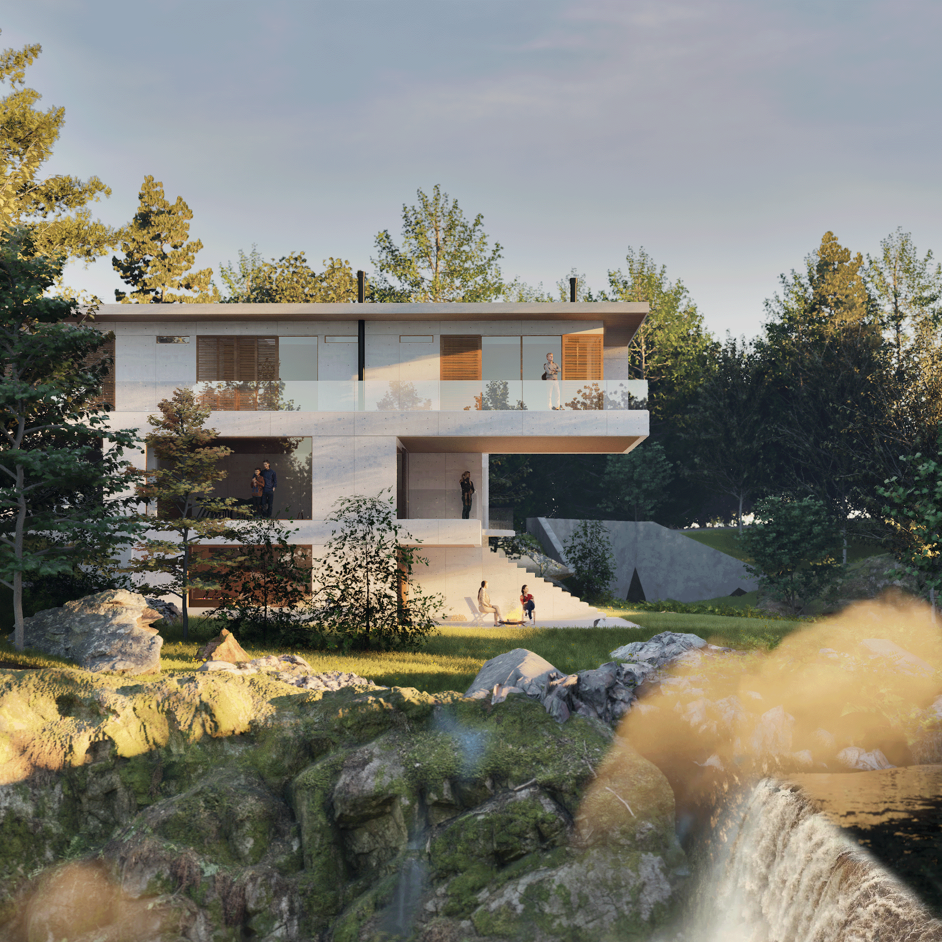 Competition entry and design proposal for a house in upstate Pennsylvania, USA. We recommend the demolition of existing structure which prove inconsistent with present needs would entail high maintenance. The architectural parti is composed of two modules that converge at a vertex, creating an interior courtyard and a large cantilever. The house main volume is aligned towards the waterfall, while a small room and studio look towards the opposite side. A The main volume houses entry, pantry, kitchen, dining, living spaces and circulations. Stairs are the spinal cord of the project which guide the visitor throughout the project and into the river. A large cantilever leans towards the waterfall making an impressive terrace. It allows the main wing to have a spectacular view of the site while framing the landscape. We used exposed concrete while carefully modulated to provide clarity and structural rigor. Carpentry is used throughout the house while creating elegant, warm and sophisticated atmosphere. The project honors the rich heritage of the Howard Family Trust while providing a modern and strong architecture gesture and respecting the landscape.