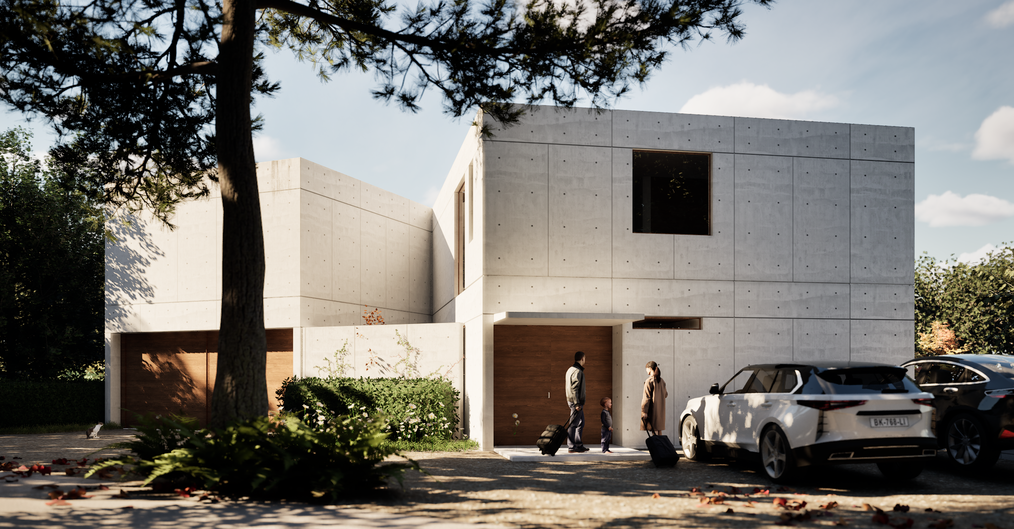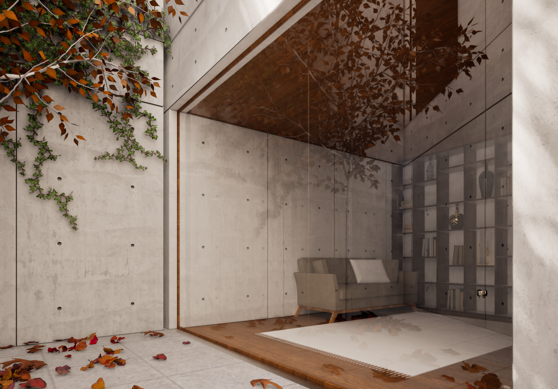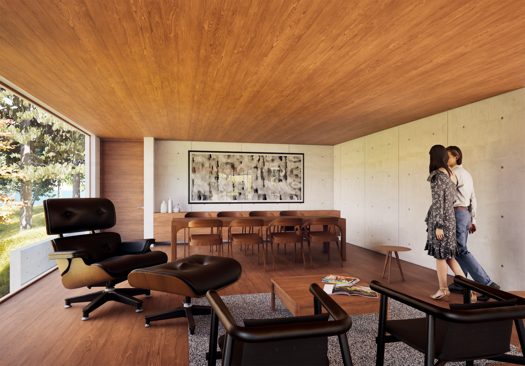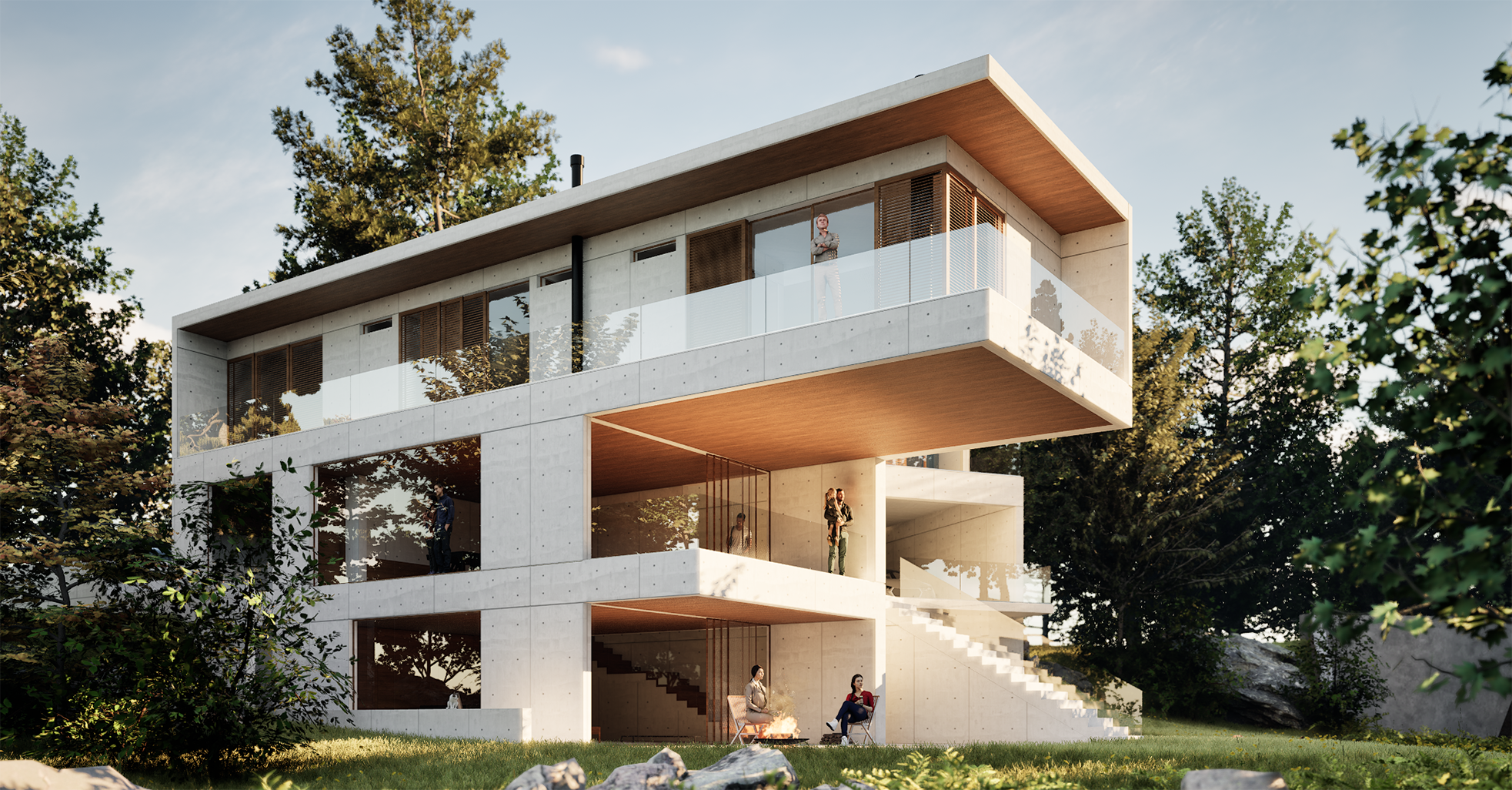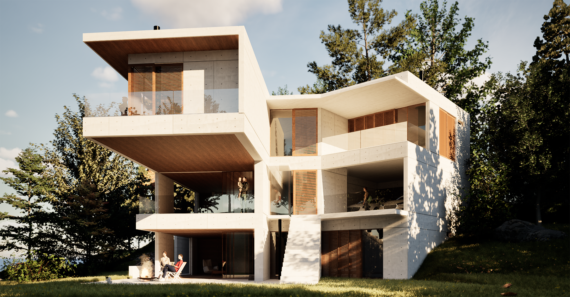 Competition entry and design proposal for a house in upstate Pennsylvania, USA. We recommend the demolition of existing structure which prove inconsistent with present needs would entail high maintenance. The architectural parti is composed of two modules that converge at a vertex, creating an interior courtyard and a large cantilever. The house main volume is aligned towards the waterfall, while a small room and studio look towards the opposite side. A The main volume houses entry, pantry, kitchen, dining, living spaces and circulations. Stairs are the spinal cord of the project which guide the visitor throughout the project and into the river. A large cantilever leans towards the waterfall making an impressive terrace. It allows the main wing to have a spectacular view of the site while framing the landscape. We used exposed concrete while carefully modulated to provide clarity and structural rigor. Carpentry is used throughout the house while creating elegant, warm and sophisticated atmosphere. The project honors the rich heritage of the Howard Family Trust while providing a modern and strong architecture gesture and respecting the landscape.